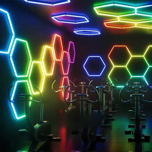 Equipamiento completo para gimnasios: iluminación deportiva LED, espejos de pared, decoración motivacional, sistemas de sonido, y ambientación moderna para crear espacios funcionales y atractivos.
